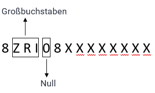 Unsere unten genannte Beispielzählernummer fängt mit „8ZRI0“ an. Bitte beachten Sie bei der Eingabe folgenden Hinweis: